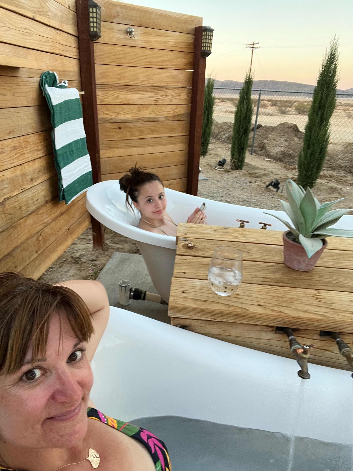 Une fois installés, on prend l’apéro! Et au coucher du soleil un bain dehors!